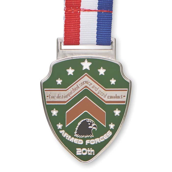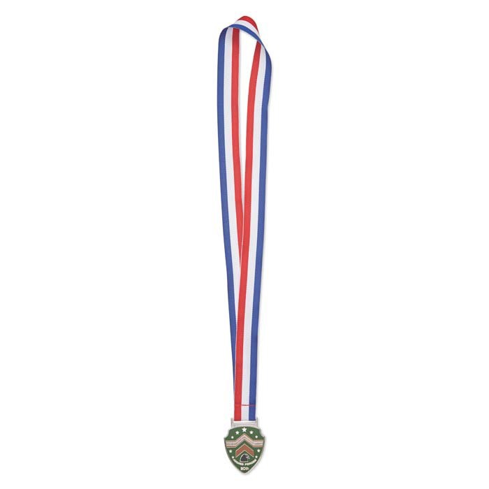 Medalhas de ferro personalizadas com fitas de poliéster ou rPET de 80 cm costuradas em V, impressas em cores em ambos os lados com largura de 20mm, 25mm, 30mm ou 35mm.. As medalhas têm um desenho em relevo que não é esmaltado no anverso. Um logotipo gravado pode ser adicionado no verso. Nomes e números individuais podem ser gravados no verso de cada medalha. Com acabamento liso ou áspero. Escolha entre 8 cores diferentes de revestimento (Cobre, Zinco, Níquel ou Ouro, as 4 com versões normais e antigas) e selecione a que melhor se adequa ao seu desenho.