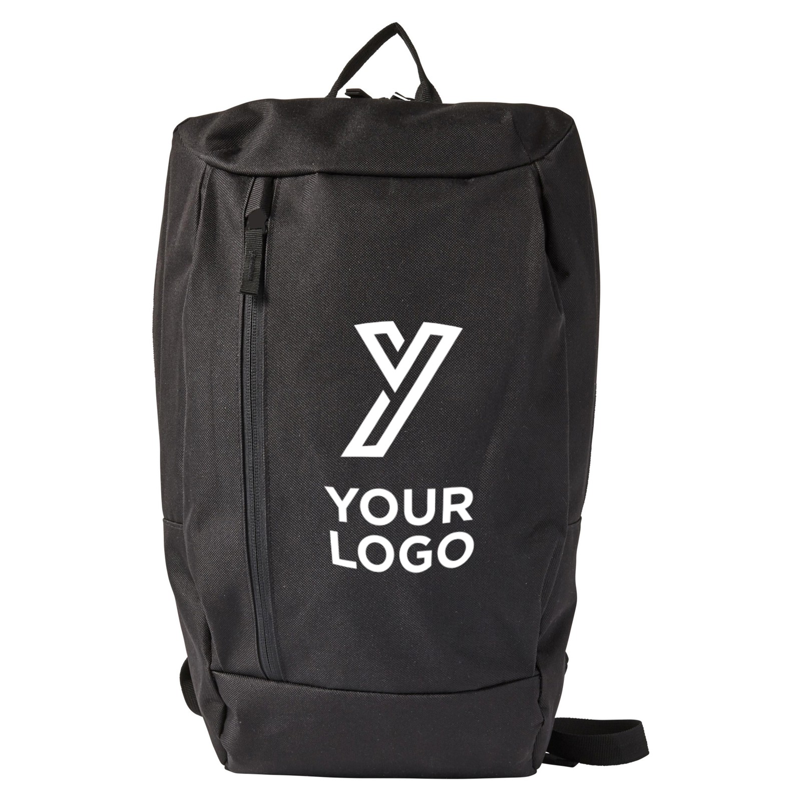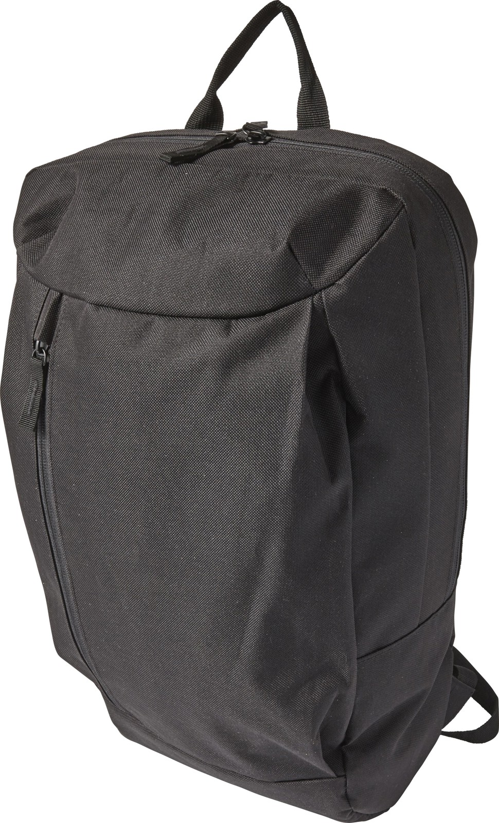 Mochila de poliéster (600D) com compartimento dianteiro, alças de ombro ajustáveis acolchoadas e costas acolchoadas.