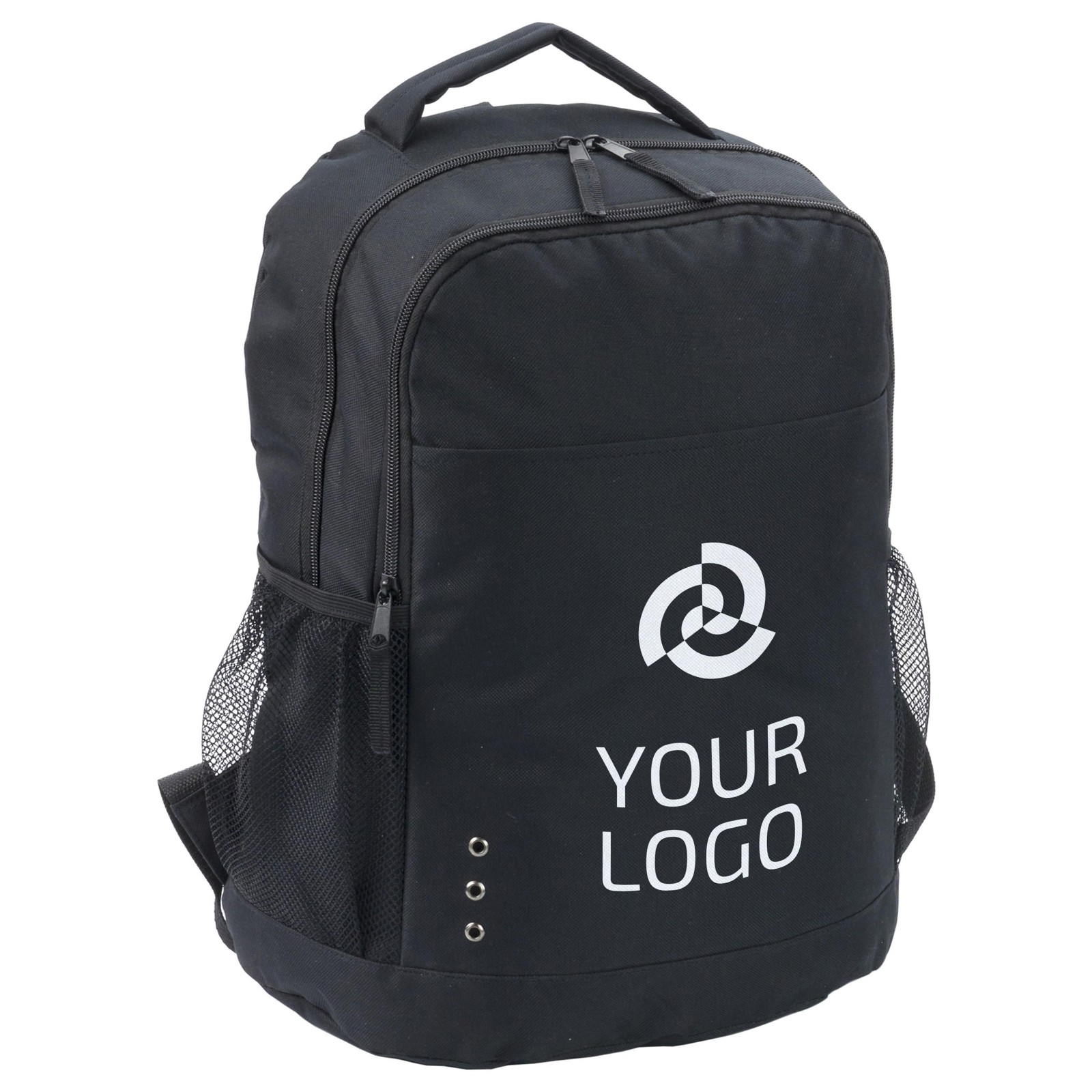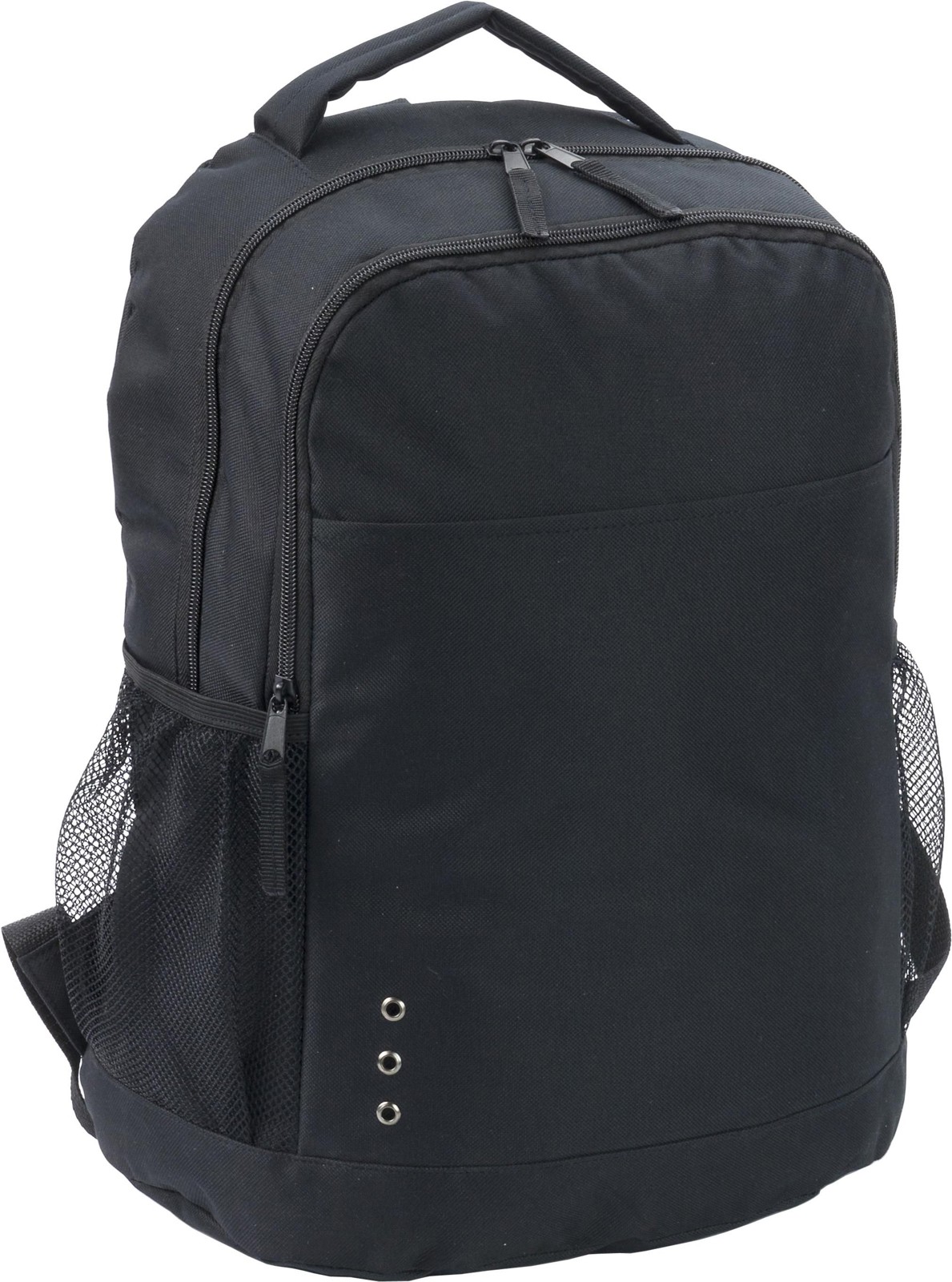 Mochila de poliester 600D com dois bolsos principais com fecho de correr e dois bolsos laterais. Com alças ajustáveis.