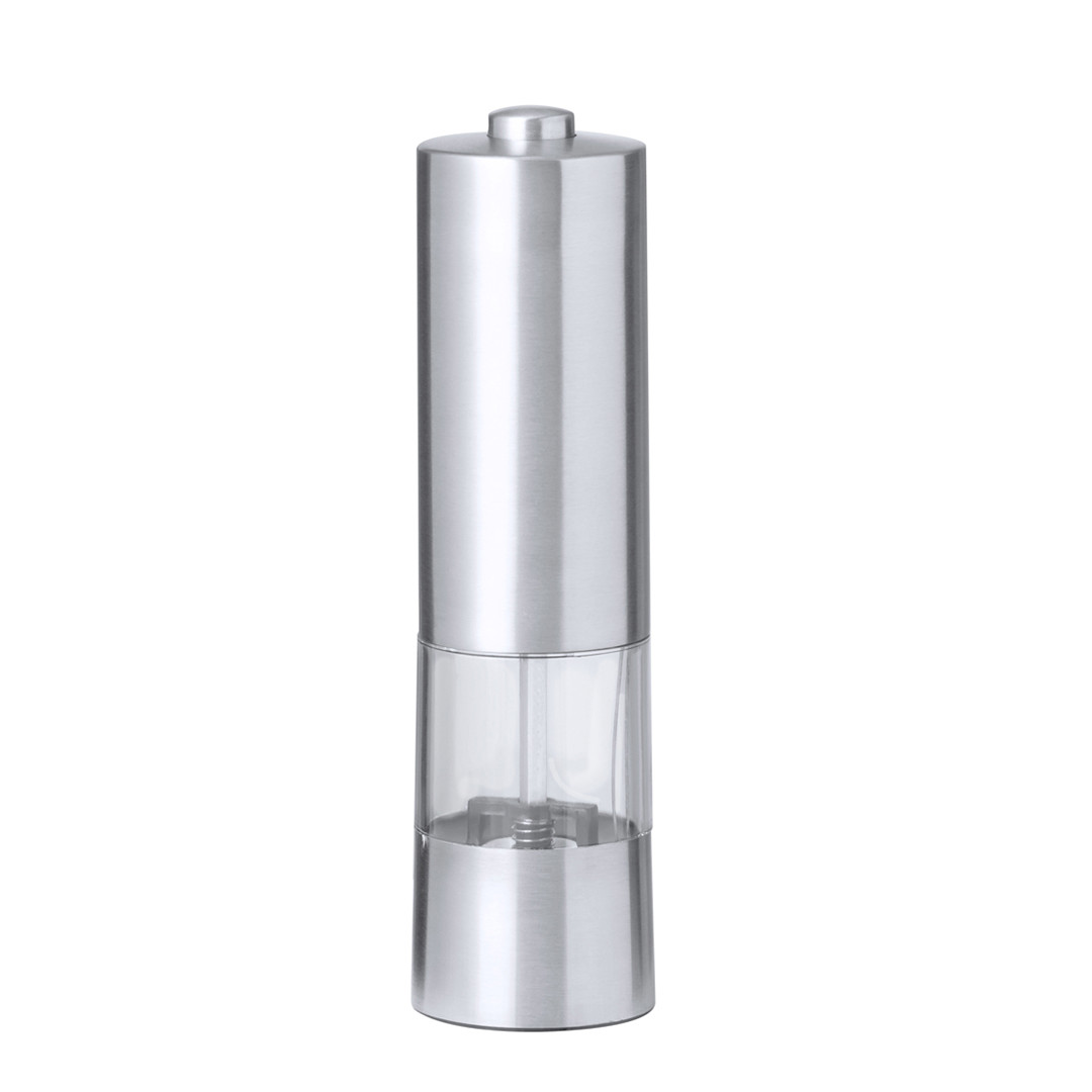 Moinho elétrico para sal e pimenta em aço inoxidável. Ideal para adicionar a especiaria mais desejada no compartimento de 70 ml, temperar premindo no botão superior podendo ajustar o tamanho do grão. Equipado com uma janela para visualizar a quantidade de especiarias que contém e com luz LED. Alimentado por 4 pilhas AAA (não incluídas) e apresentada numa caixa de design kraft. 1 Led. Moedor Regulável. 4 Pilhas AAA Não Incluídas