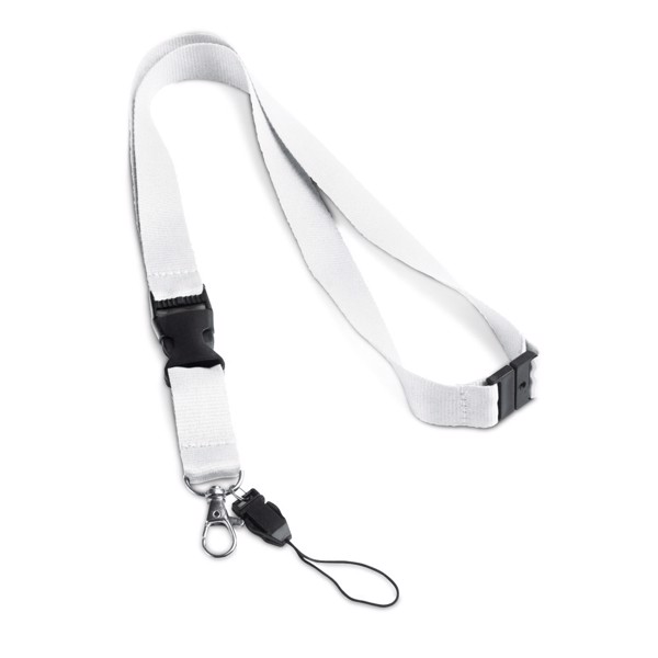 Lanyard em poliéster, com mosquetão em metal, fivela amovível, fita para telemóvel e fecho de segurança. 20 x 510 mm