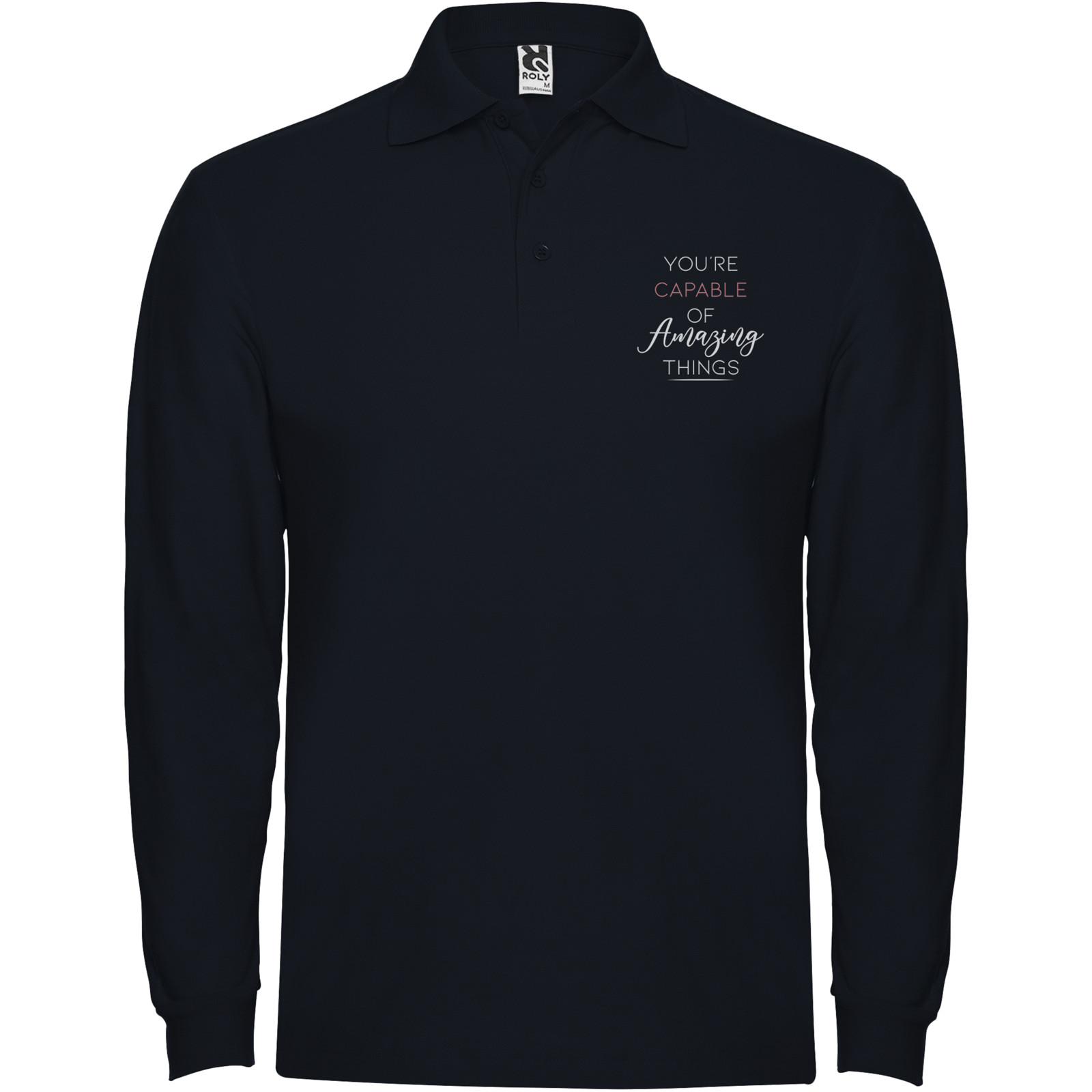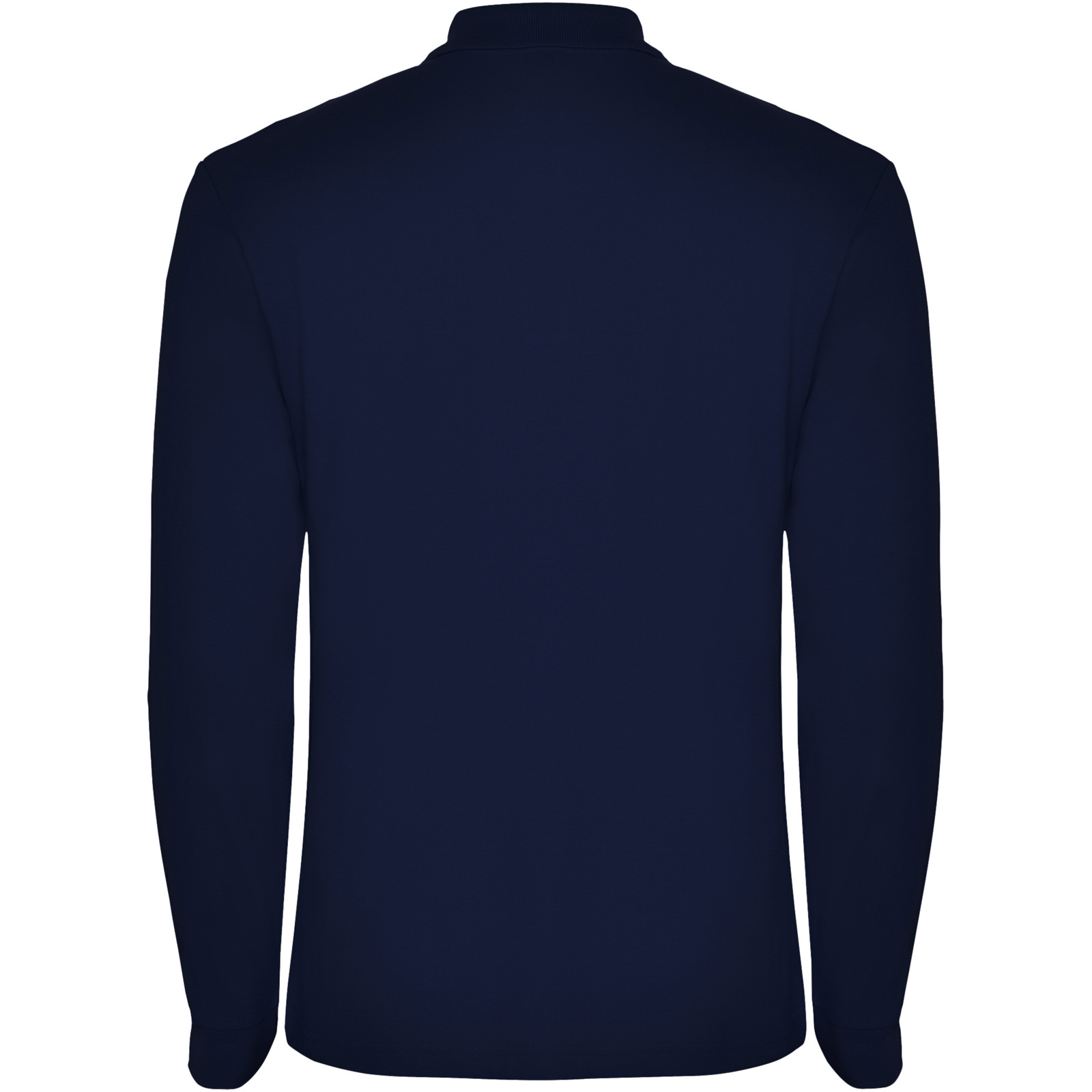 Polo de manga comprida com gola e punhos canelados, carcela de três botões e punhos canelados em elastano 1x1. Tapa costuras reforçada na gola. Bolso opcional. Etiqueta amovível. O modelo tem 190 cm e está a usar o tamanho L.