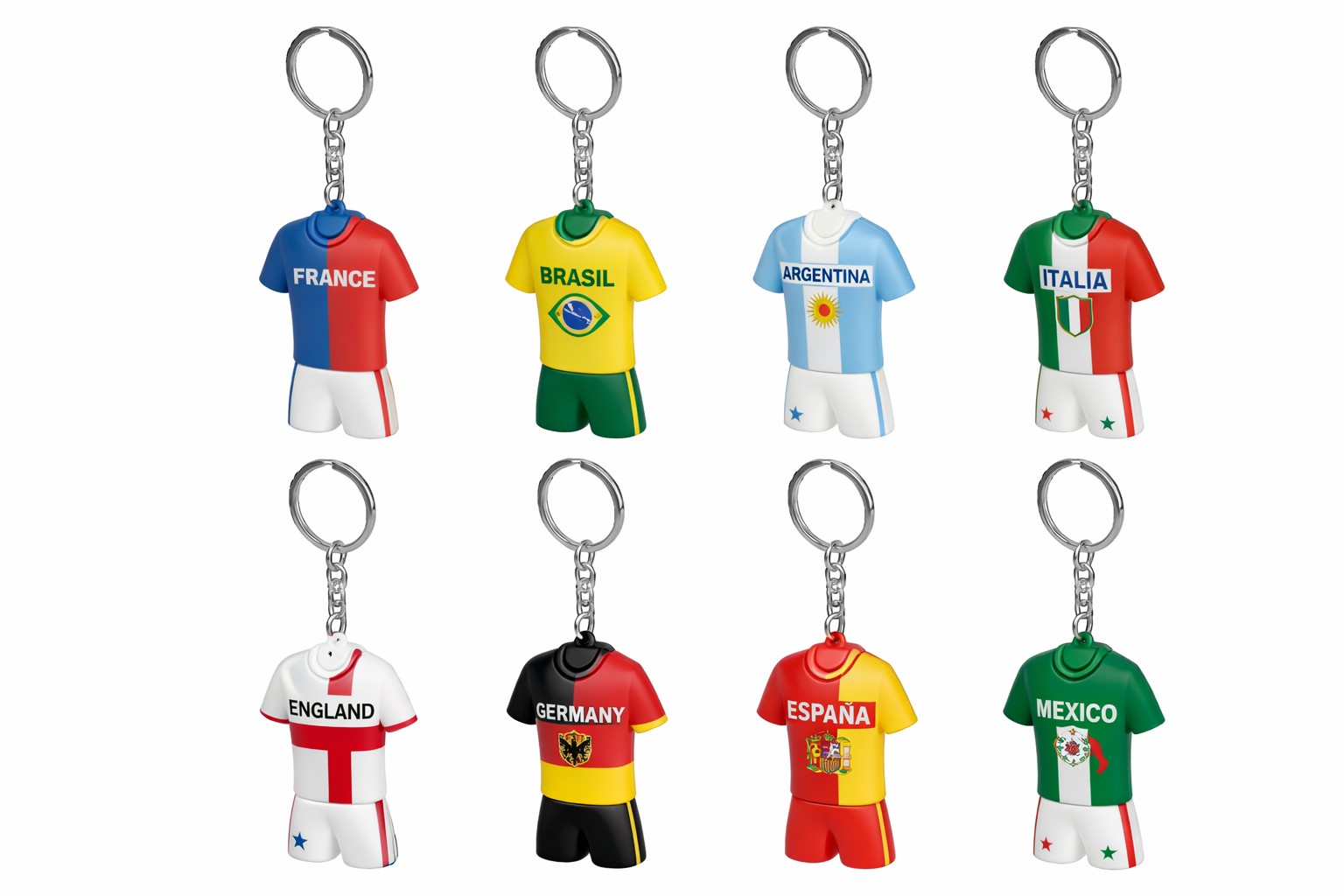 TEMPO DE PRODUÇÃO 35 DIAS. O Porta-Chaves Equipamento de Futebol com Tema de Países é o acessório perfeito para fãs de futebol que querem levar a paixão pela sua seleção para todo o lado. Com design em forma de camisola e calções, este porta-chaves representa as cores e símbolos de diferentes países, tornando-o um artigo colecionável e altamente atrativo.