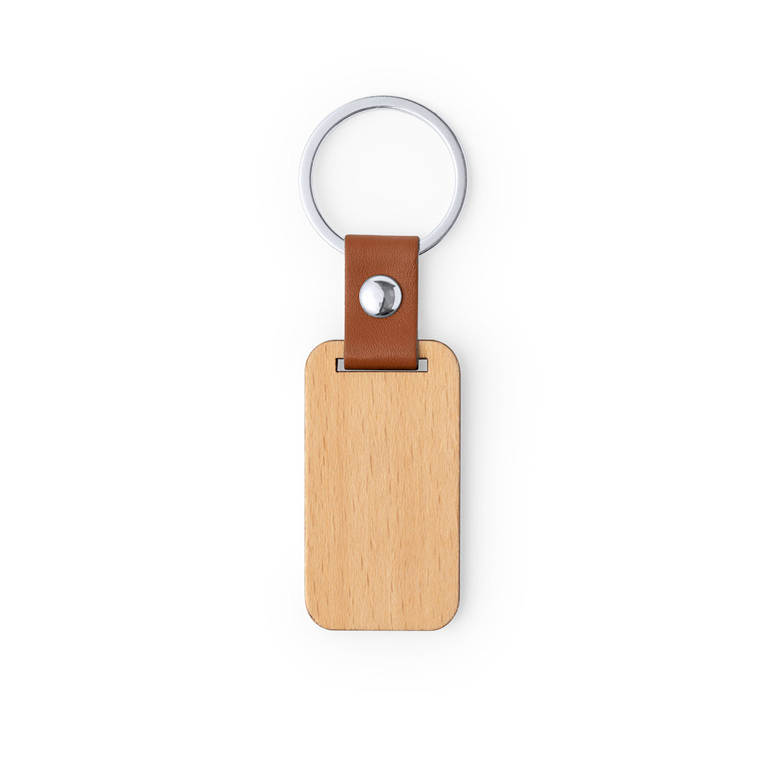 Porta-chaves de linha nature fabricado em madeira natural, com original fita em PU castanha e remate cromado. Disponível em desenhos retangular e circular.