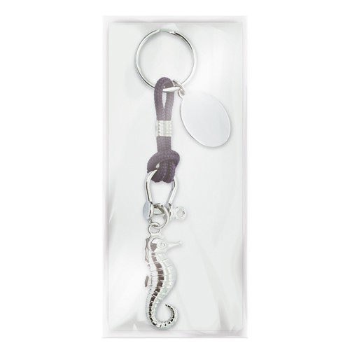 Porta-chaves cavalo-marinho prateado, inclui detalhe de corda azul.Inclui uma placa para marcação a laser.Cada peça em bolsa individual com fecho automático (é fornecida aberta, para facilitar a sua manipulação).