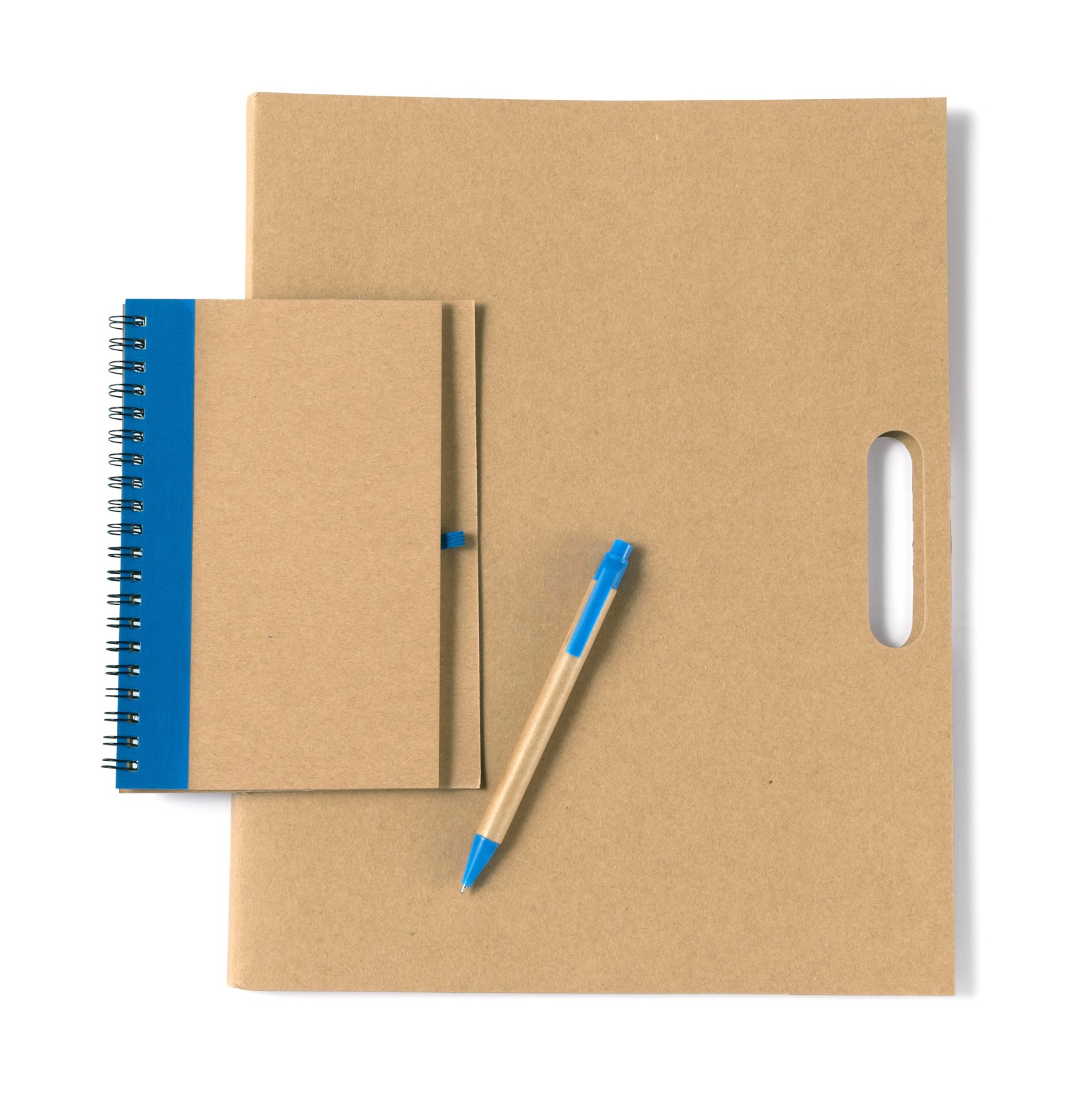 Pasta de papelão com pega. No interior inclui 150 memos adesivos, bloco de notas pautado 25 páginas de material FSC e esferográfica de cartão. Escrita azul.