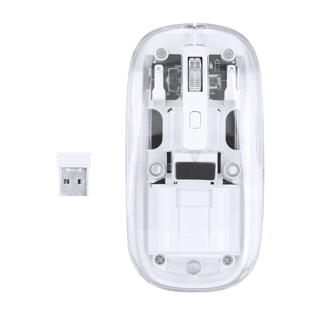 Rato ótico sem fios com desenho original, com corpo transparente que permite visualizar os componentes internos do dispositivo. Com bateria integrada de 300 mAh e porta de carregamento Tipo C (cabo incluído). Inclui botão DPI, com conexão “plug and play” via USB e vem apresentado em caixa individual de design kraft. Sem Fios. Óptico. Botão DPI. Bateria 300 mAh