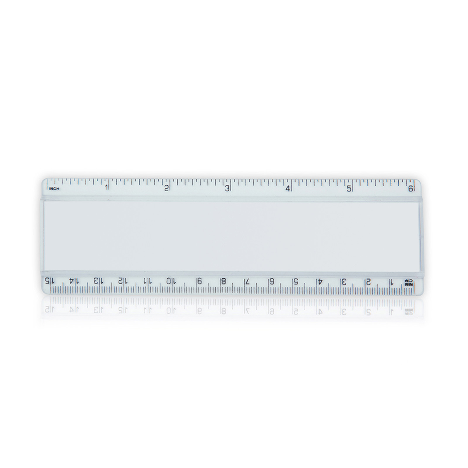 Régua de plástico personalizável de 15cm com fotografia, logótipo ou texto. Pode personalizar a régua ao seu gosto. Só precisa de criar um desenho, cortá-lo no tamanho correto e inserir o papel na régua e fechar tudo com o suporte transparente. Personalizável em 1 face com inserção de papel. (155x30mm)