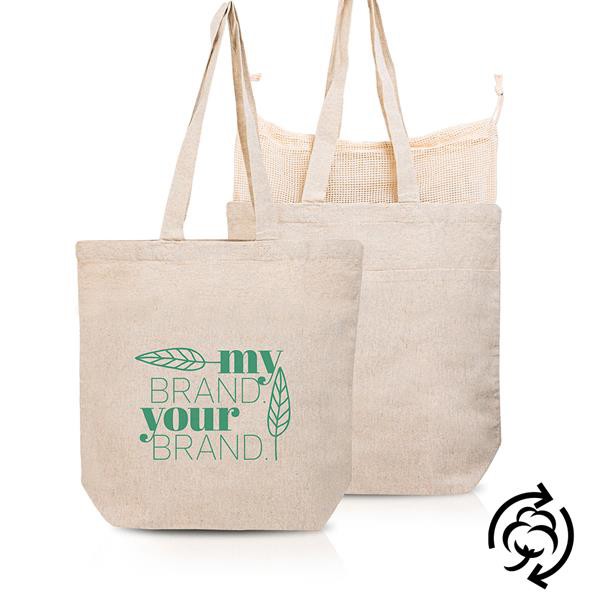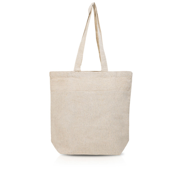 Saco de Algodão reciclado 190 g com extensível em rede e bolso exterior. Feito a partir de algodão reciclado de 190 gramas, este saco é uma escolha consciente para o meio ambiente. Contribua para a redução de resíduos e a conservação dos recursos naturais.Com medidas generosas de 39 * 40 * 12 cm, este saco oferece um amplo espaço para transportar as suas compras, pertences pessoais ou o que mais precisar. Além disso, possui uma extensão em rede de 15 cm que permite aumentar a capacidade quando necessário. O nosso saco é certificado pelo Global Recycled Standard (GRS), o que garante que o material reciclado utilizado cumpre os padrões mais rigorosos de qualidade e sustentabilidade.