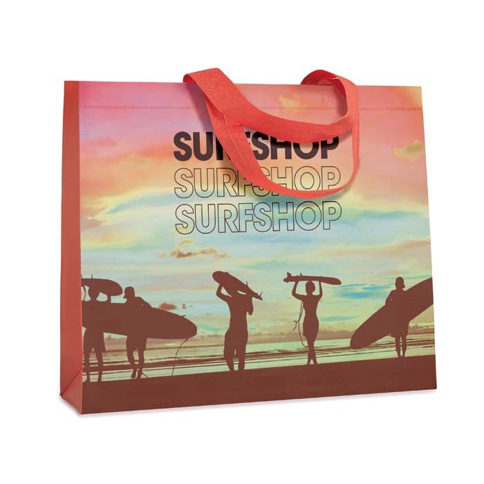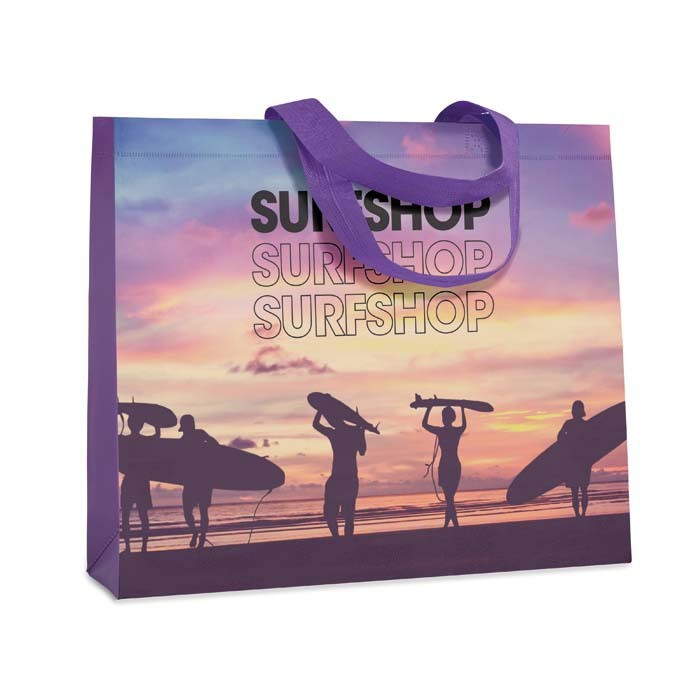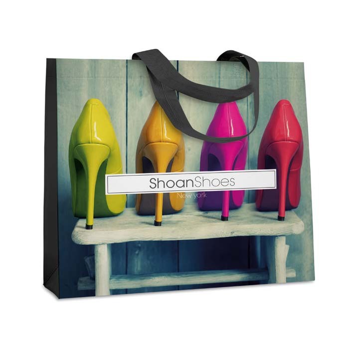 Prazo de entrega a partir de 6 semanas. Saco de compras horizontal selado a quente com pegas curtas em não-tecido. Dimensões do saco: 45x35x10cm. Pegas: 60cm, largura 2,5cm. Tecido Selecione um tecido não tecido e adicione os seus desenhos de logótipo impressos em serigrafia ou opte por tecidos laminados (não tecidos) com o seu desenho a cores.