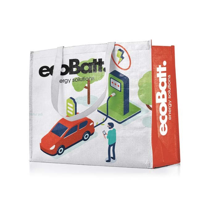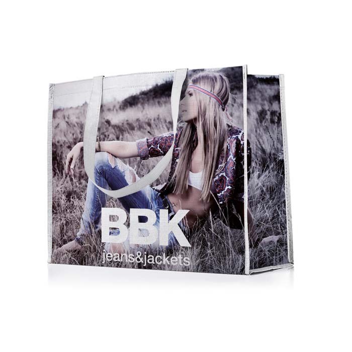 Prazo de entrega a partir de 6 semanas. Saco de compras horizontal com alças longas. Dimensões do saco: 42x32x16cm. Alças: 60cm, largura: 2,5cm. Alças Escolha tecido próprio ou a construção em tecido PP mais resistente. Selecione uma das cores padrão ou forneça o PMS desejado e nós procuraremos a cor mais próxima disponível. Tecido Selecione tecido não tecido e adicione seus logótipos impressos em tela ou opte por tecidos laminados (não) tecidos com seu design em cores completas.