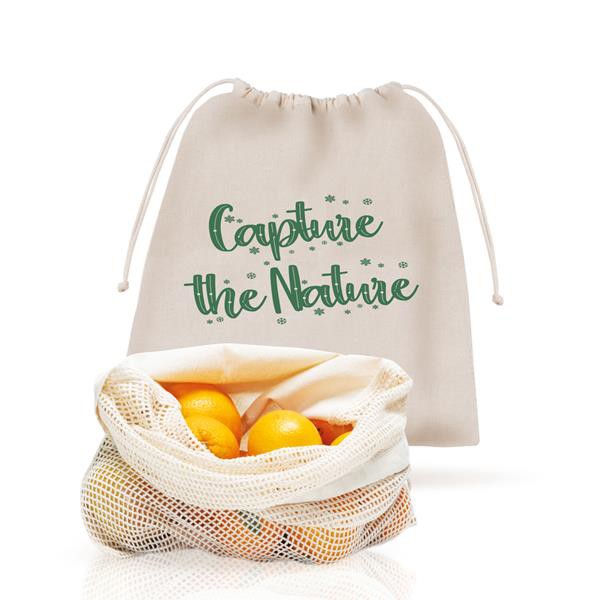 Saco em rede com atilhos, 100% algodão. Um saco com duas faces, uma em rede de algodão e outra em algodão 140g/m2 e dois atilhos. Este saco é ideal para compras de frescos, como legumes e pão, ou então como bolsa para transportar objetos pessoais dentro do seu saco.