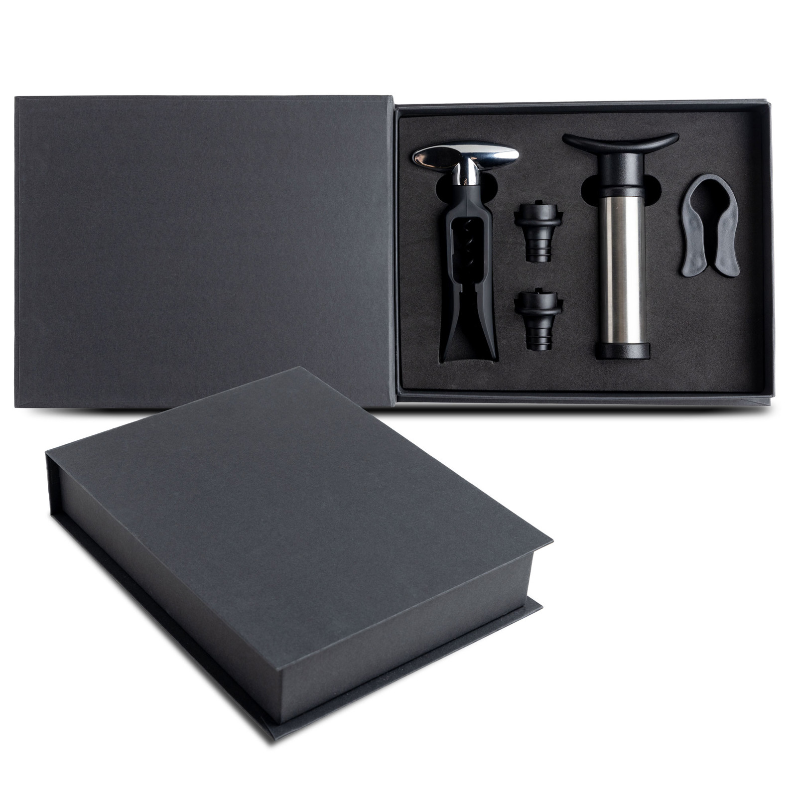 Set de vinho com bomba e rolhas de vácuo, saca-rolhas e corta cápsulas. Este é o brinde ideal para qualquer apreciador de vinhos. Um Kit completo que lhe oferece numa caixa presente magnética um corta-cápsulas e um saca-rolhas para que possa preparar o vinho e, para que o possa guardar sem mexer com as suas propriedades, tem ainda duas rolhas e uma bomba de vácuo. Do incicio ao fim na companhia deste brinde especial. Brindemos à vida!
