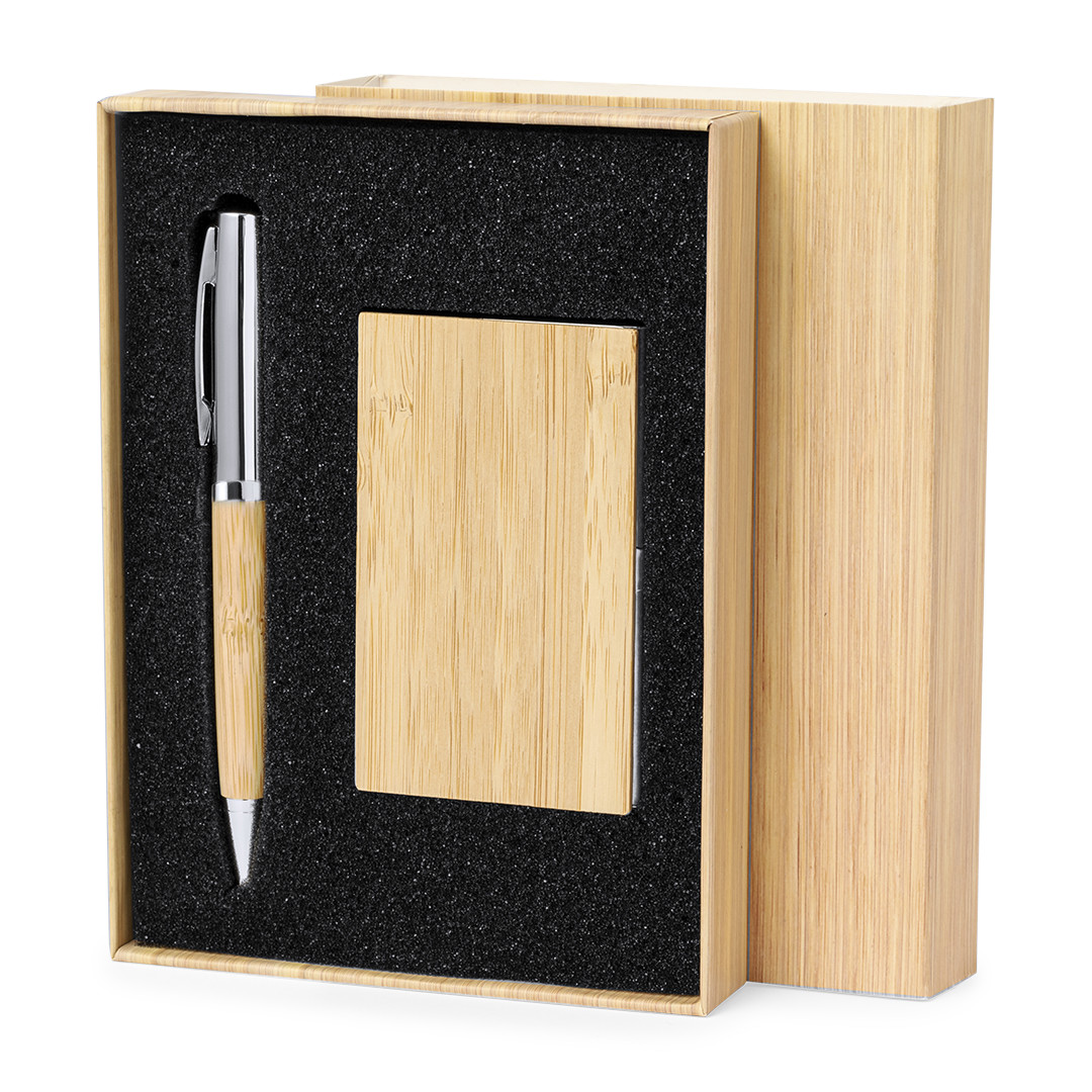 Distinto set esferográfica e porta-cartões em bambu e metal. Conjunto prático de esferográfica com corpo em metal brilhante e pega em bambu macio com mecanismo de torção e tinta azul. Inclui um excelente porta-cartões monocompartimentado em metal brilhante, com tampa em bambu macio. Apresentado numa caixa individual com design em bambu.Materiais como o bambu favorecem a utilização de matérias-primas naturais, reduzindo as emissões poluentes. Provém de uma planta muito resistente e versátil, de crescimento e regeneração rápidos, o que o torna uma excelente alternativa à utilização da madeira tradicional. Porta-Cartões 1 Compartimento. Esferográfica