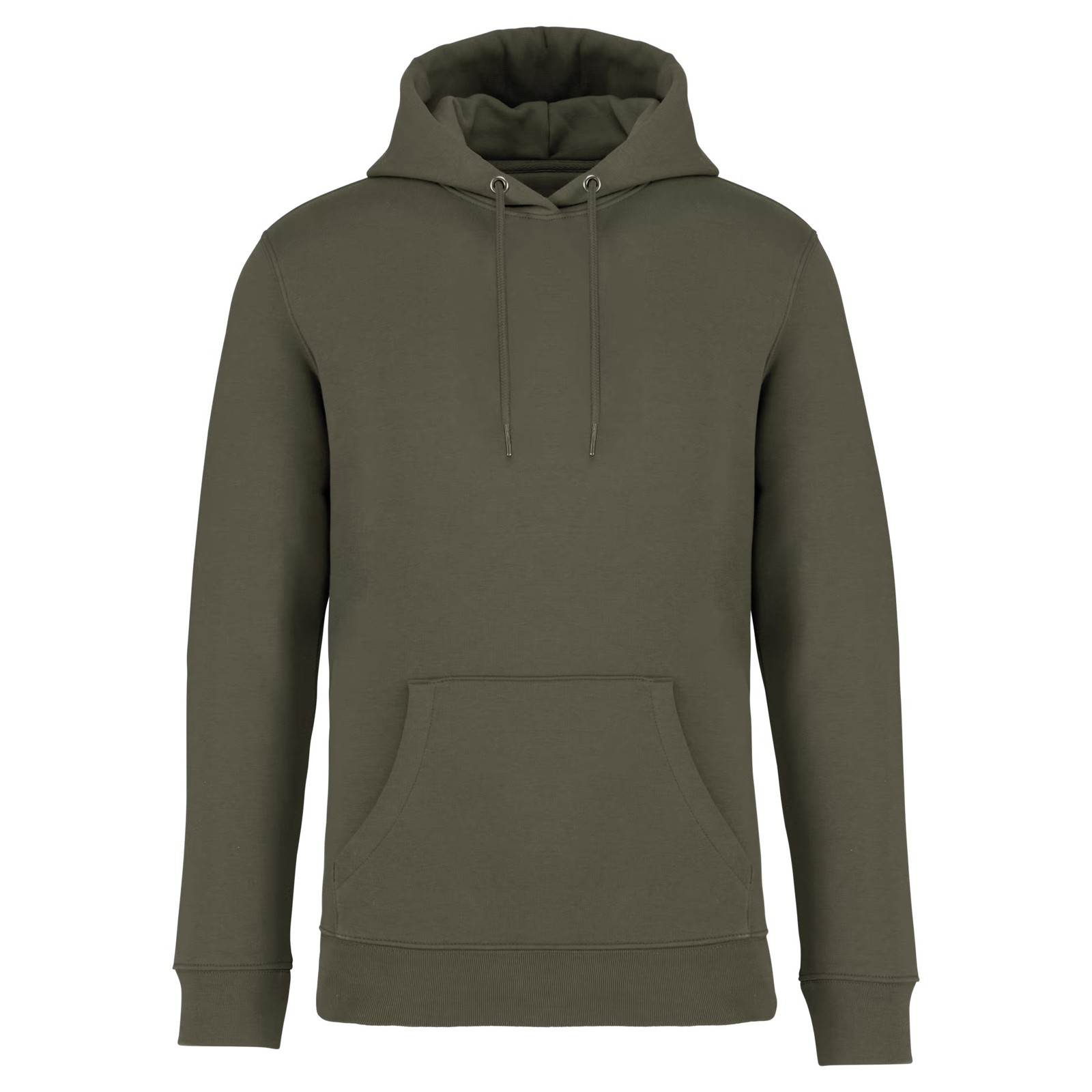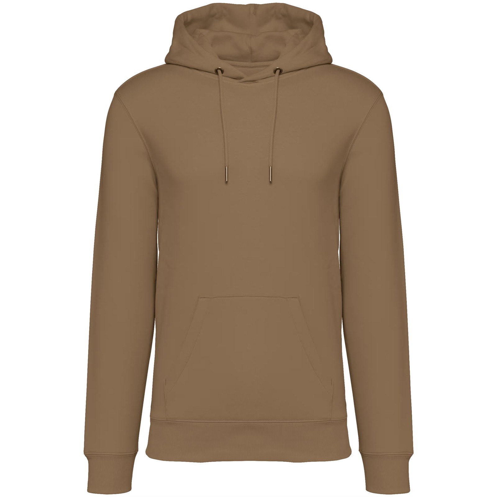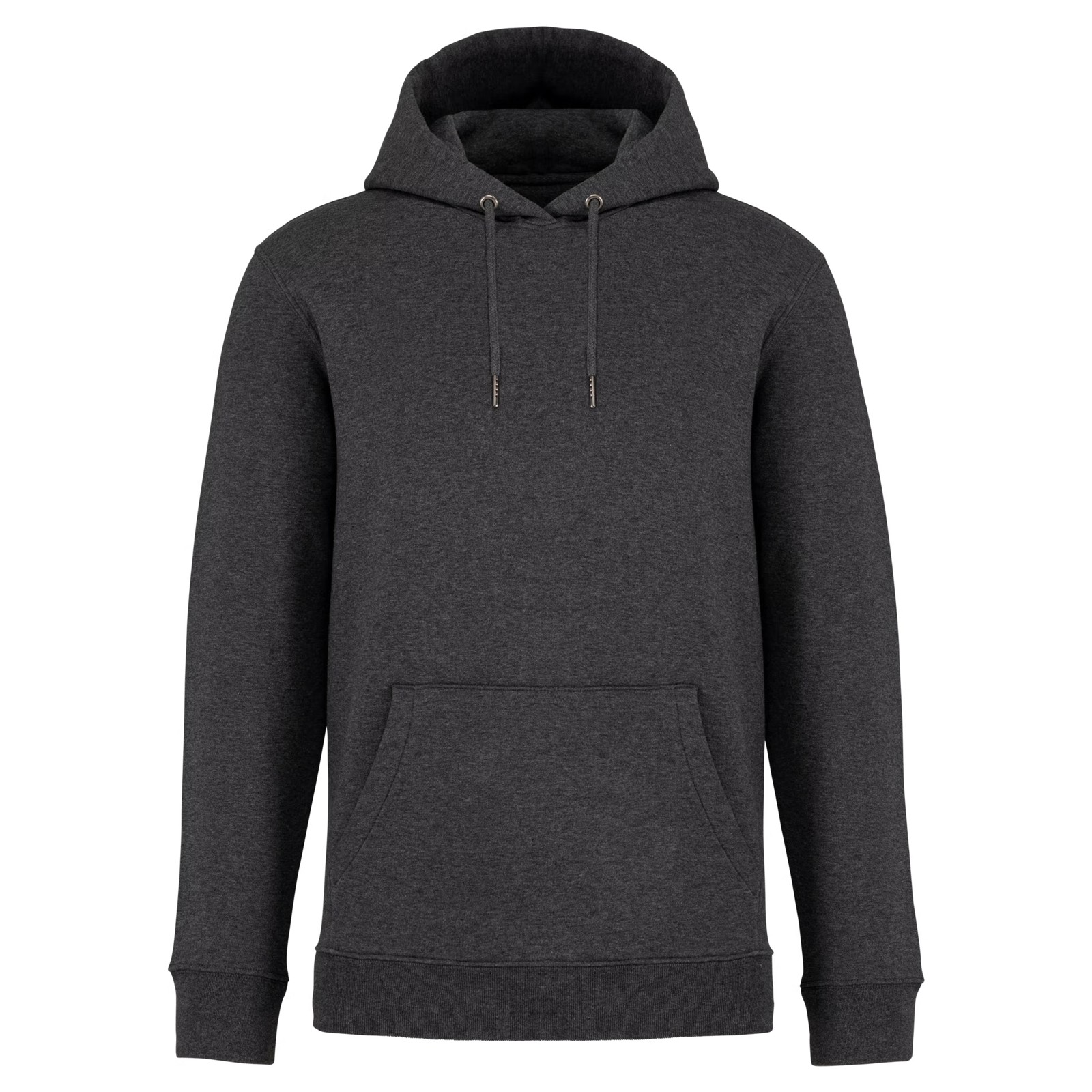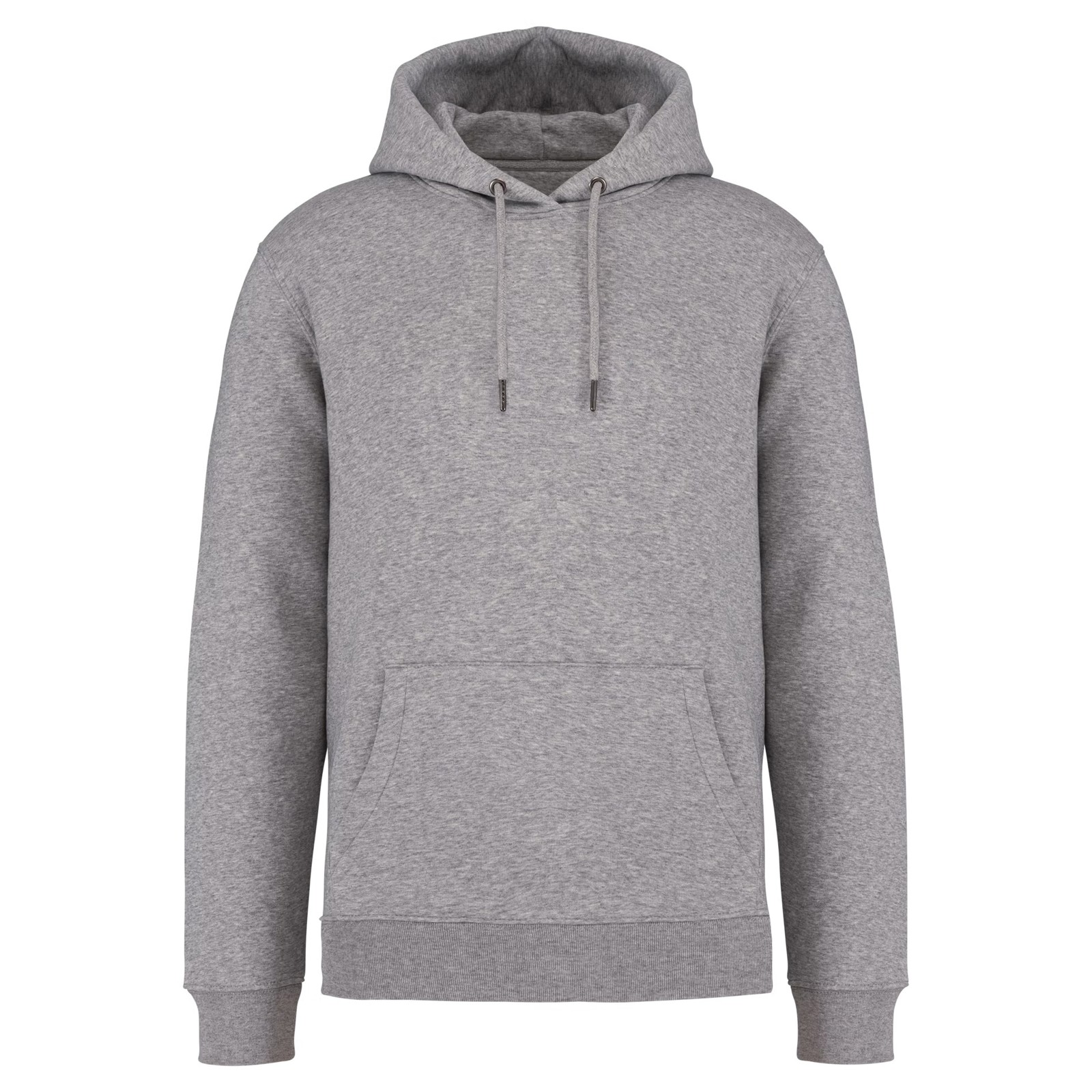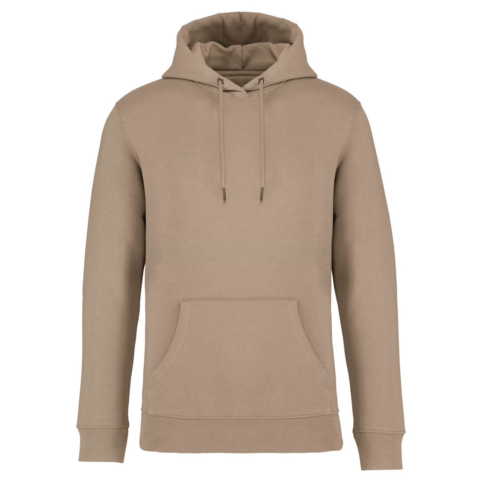 85% algodão biológico / 15% poliéster reciclado pós-consumo. Algodão penteado ringspun. Corte justo. Banho de enzimas. Interior cardado 3 fios LSF (Low Shrinkage Fleece: cardado pré-encolhido). Meia-lua nas costas. Bolso à canguru. Malha rib 1 x 1 no decote, no cós e nos punhos. Pesponto duplo no decote, nas cavas, no cós e na meia-lua. Tapa-costuras no interior do decote nas costas. Capuz forrado no material principal com ponto de reforço no cordão. Cordão redondo com extremidades e ilhós em metal reciclado. A cor Raw Natural distingue-se pelo seu aspecto bruto visualmente texturado, salpicada de partículas finas visíveis a olho nu.