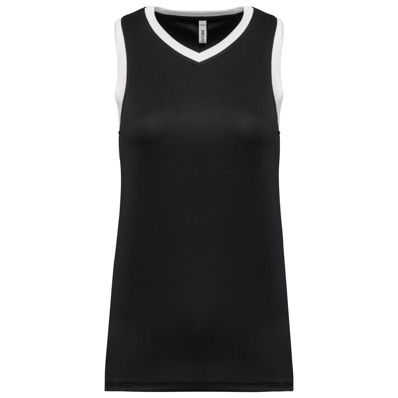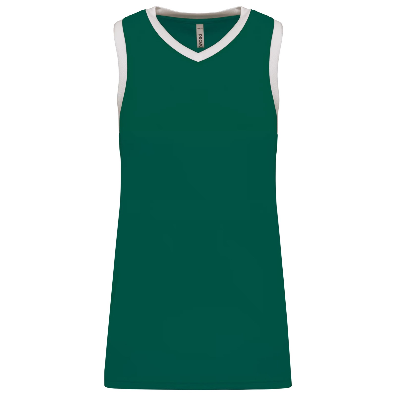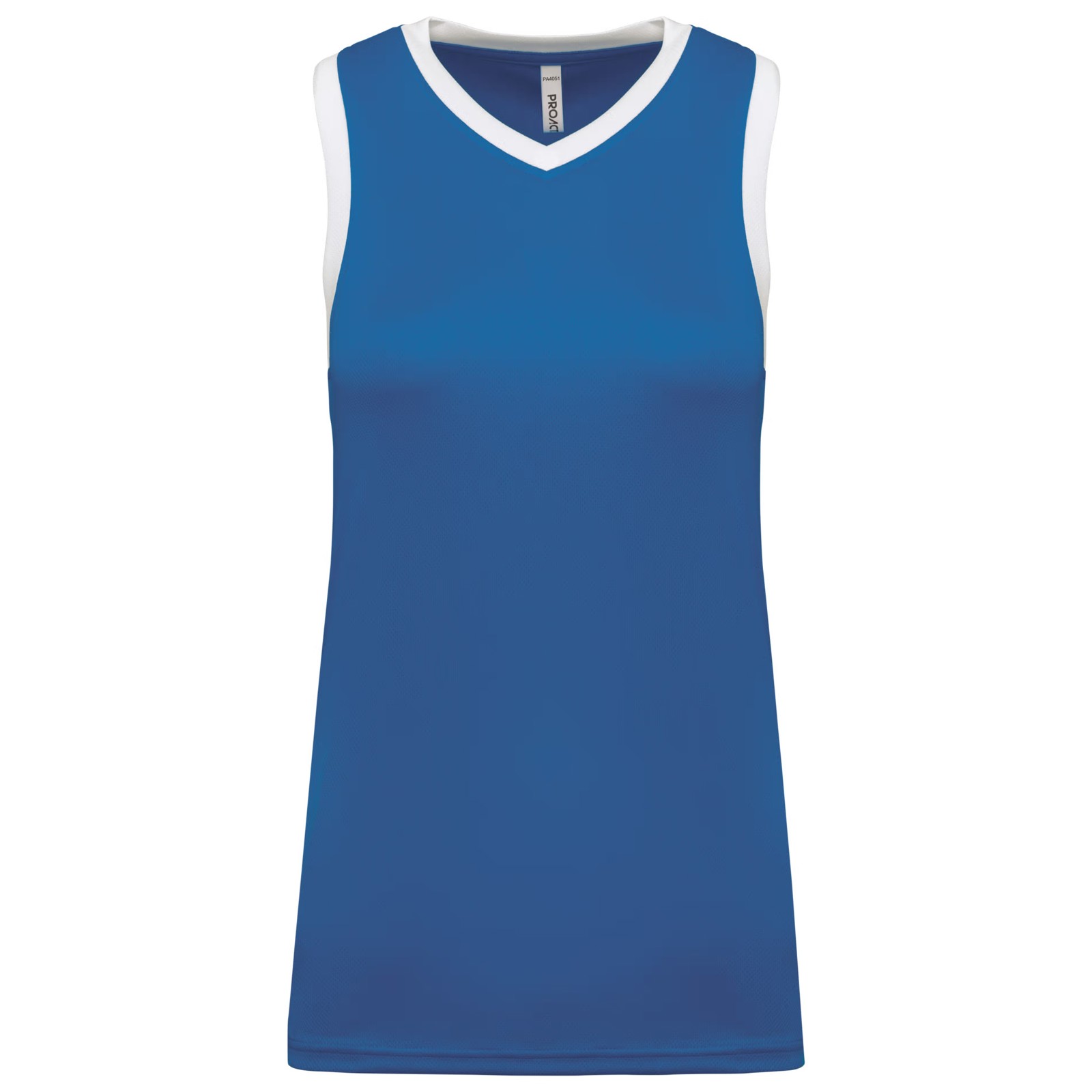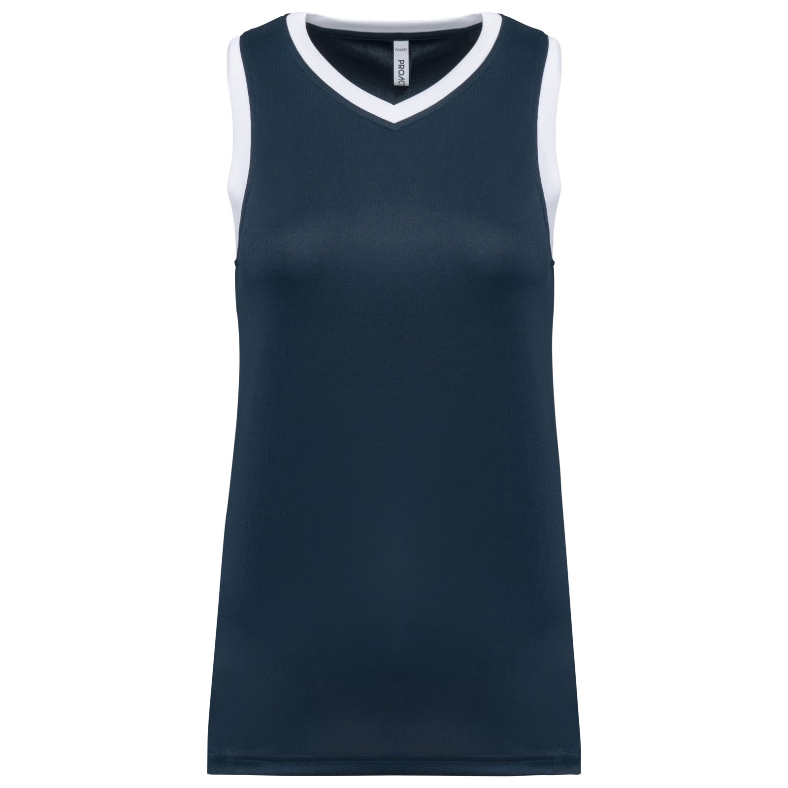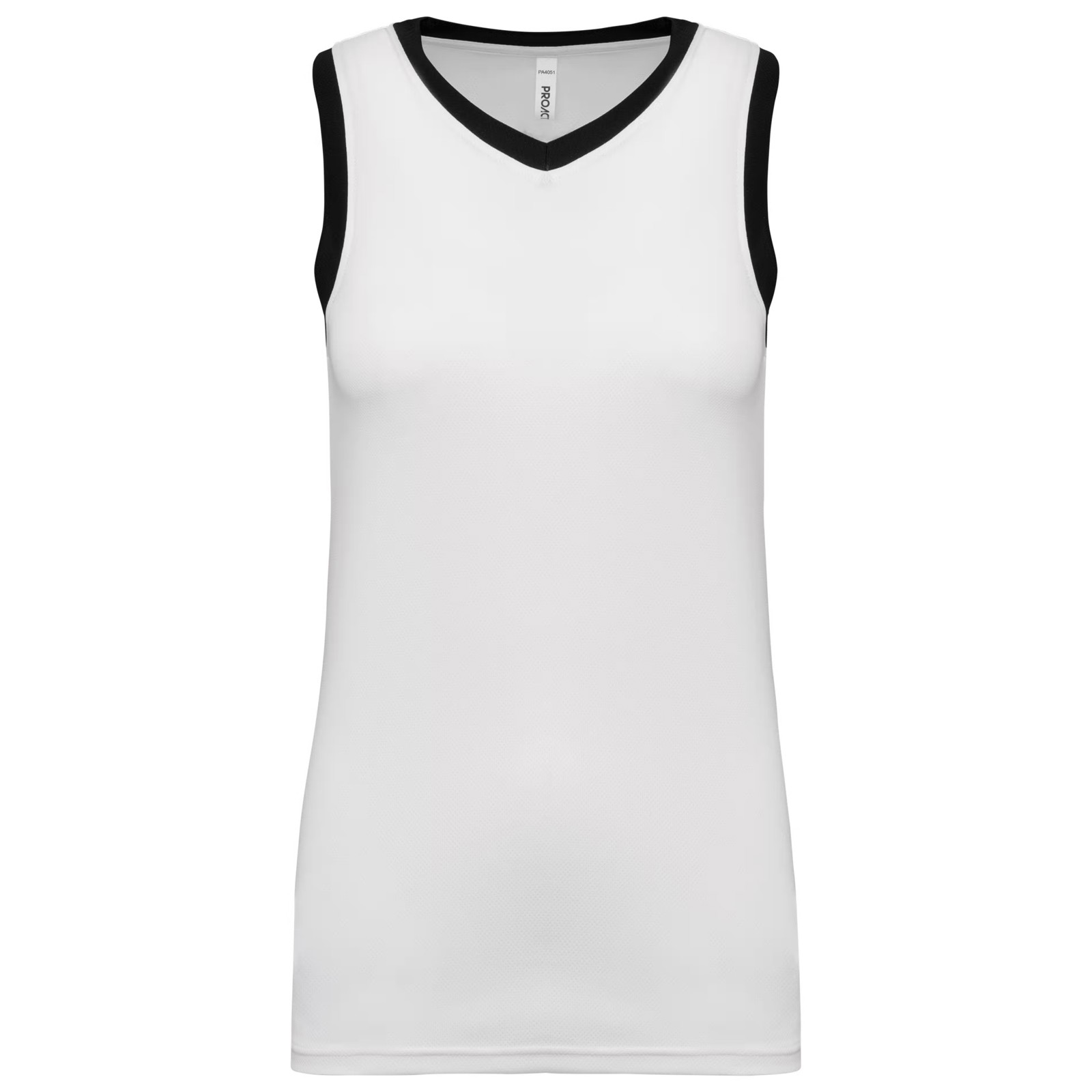 100% poliéster birdseye. Decote em V. Viés em contraste no decote e no acabamento da cava. Bainha com costura dupla. Etiqueta de marca amovível.