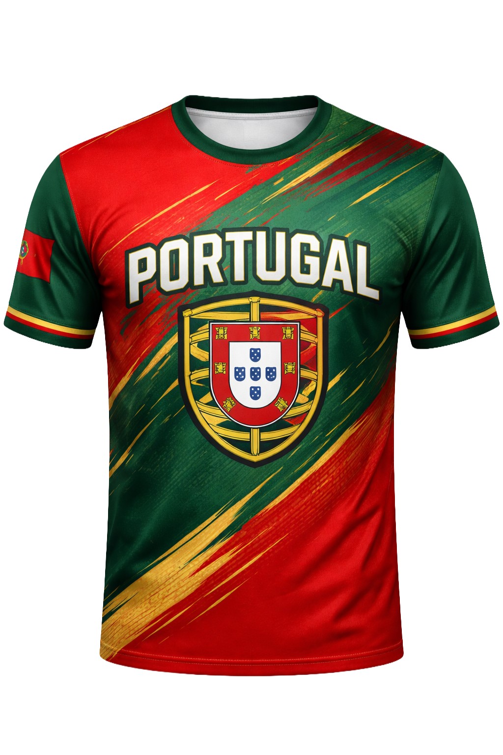 T-shirt 100% personalizada em poliéster, com design moderno inspirado nas cores de Portugal, ideal para eventos, ações promocionais, merchandising ou uso em grupo; produzida em tecido leve, confortável e resistente, com impressão de alta qualidade que garante cores vivas e duradouras mesmo após várias lavagens; quantidade mínima de 10 unidades e prazo de produção até 20 dias.