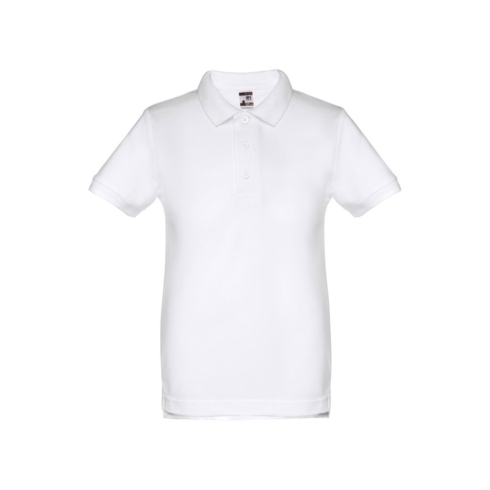 Polo para criança (unissexo) de manga curta em malha piqué 100% algodão (195 g/m²). Contém gola e mangas em Rib, sendo a gola reforçada com fita em piqué. Na parte frontal, junto da gola, encontram-se três botões à cor (botão suplente inserido na costura interior) e carcela reforçada. Peça cortada e cosida com pequenas aberturas laterais na parte inferior do polo. Tamanhos: 2, 4, 6, 8, 10, 12 Tamanhos: 2, 4, 6, 8, 10, 12