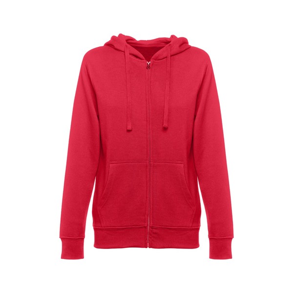 Sweatshirt para senhora em 50% algodão e 50% poliéster (320 g/m²) com interior cardado. O capuz é forrado e contém fecho com cordão à cor. Na zona frontal encontram-se dois bolsos marsupiais com fecho plástico com cobertura. Peça com punhos e cós em Rib. Tamanhos: S, M, L, XL, XXL