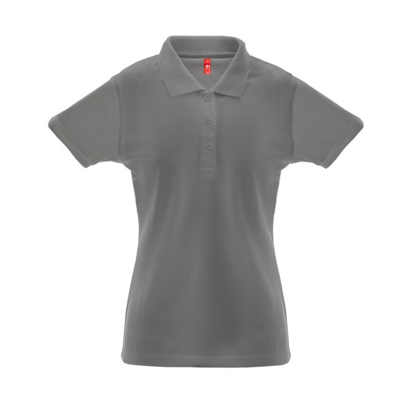 Polo de manga curta para mulher em malha piqué 35% algodão cardado e 65% poliéster (200 g/m²) (cor: 183: 85% algodão/15% viscose). Polo de corte cintado com gola e mangas em Rib, sendo a gola reforçada com fita em malha piqué. Contém carcela reforçada com 3 botões à cor (botão suplente inserido na costura interior). Peça cortada e cosida. Tamanhos: S, M, L, XL, XXL