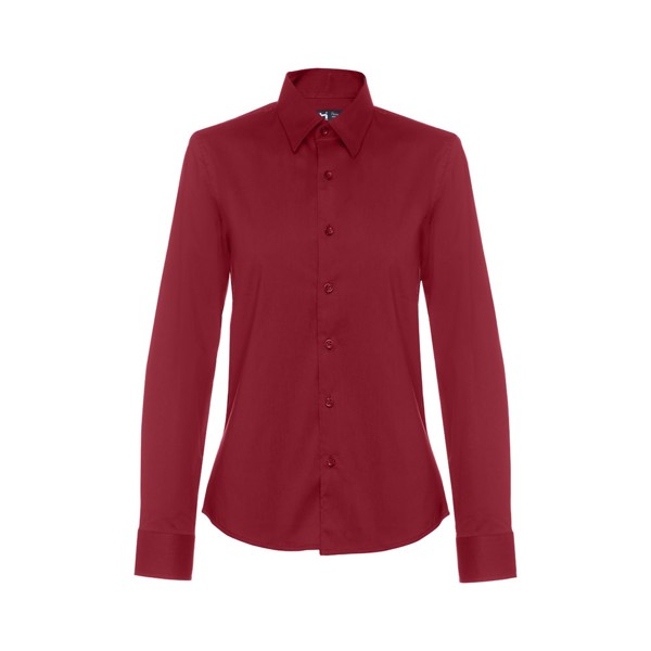 Camisa popelina de manga comprida para senhora em 68% algodão, 28% poliamida e 4% elastano (115 g/m²). Manga comprida com 1 prega e punhos ajustáveis com 1 botão. Corte cintado com 2 pinças nas costas e carcela com 7 botões à cor. Tamanhos: S, M, L, XL, XXL