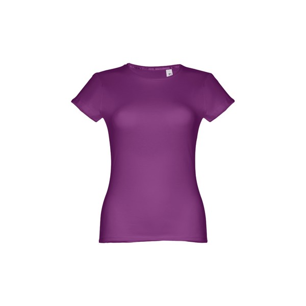 T-shirt cintada para senhora em malha jersey 100% algodão (150 g/m²) com fio de algodão cardado (cor 183: 90% algodão/10% viscose, cor 196: 98% algodão/2% viscose). Contém gola fina dupla em jersey com fita de reforço em cetim. Peça cortada e cosida com costura dupla nas mangas e parte inferior. Tamanhos: S, M, L, XL, XXL