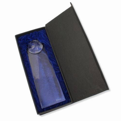 Vidro talhado em forma de prisma com a bola mundo na parte superior.Inclui luxuoso estojo de presente con forro interior de raso e fecho imantado