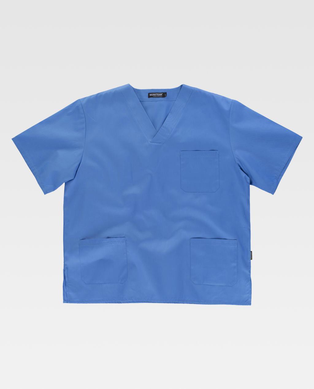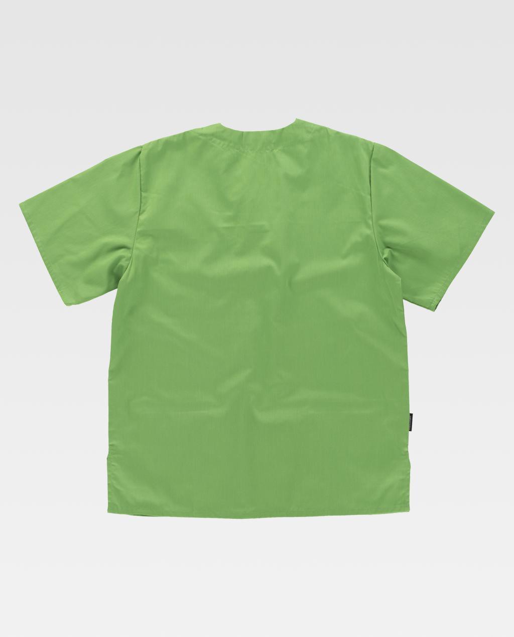 Túnica médica unissexo com mangas curtas e decote em V cruzado. Um bolso no peito e dois bolsos laterais de remendo. Aberturas nas laterais.